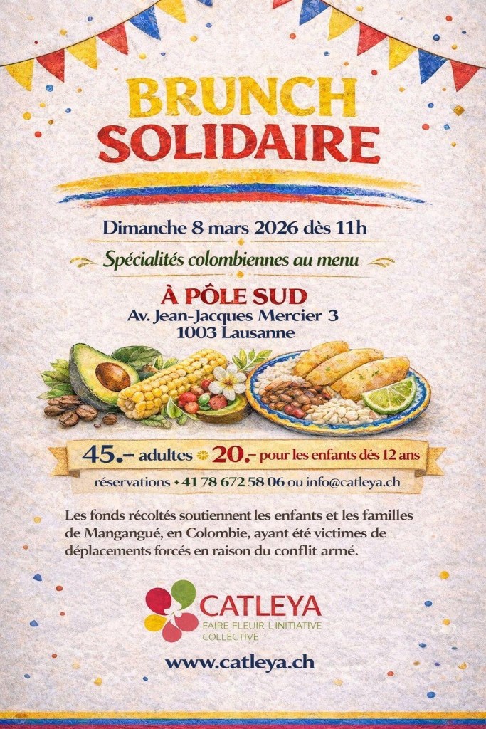 L’association Catleya vous invite à partager un brunch aux saveurs colombiennes dans une ambiance chaleureuse et conviviale. En participant, vous contribuez directement au financement d’actions de prévention, d’éducation et de protection en faveur d’enfants, de jeunes et de familles touché·es par les conséquences du conflit armé à Magangué, en Colombie.